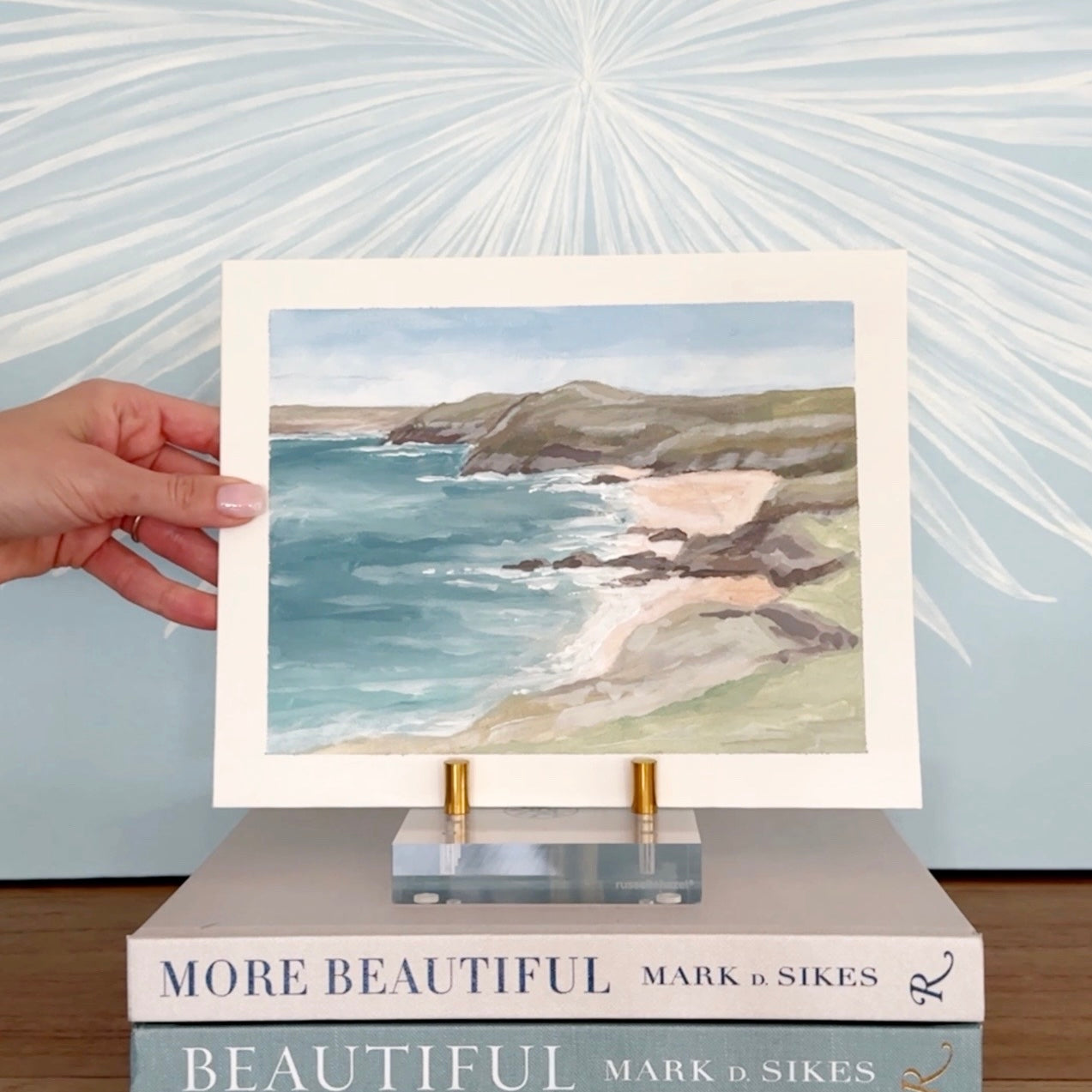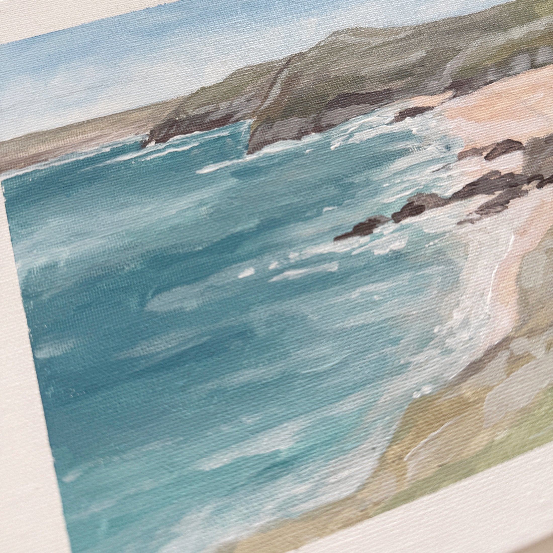 Experience the breathtaking beauty of Cornwall with this original acrylic painting, 'Cornish Coastline,' created by artist Laurie Duncan. Painted en plein air during Laurie's recent trip to the stunning Cornish coast, this piece captures the crystal-clear waters and dramatic clifftops that make Cornwall an artist's dream destination.