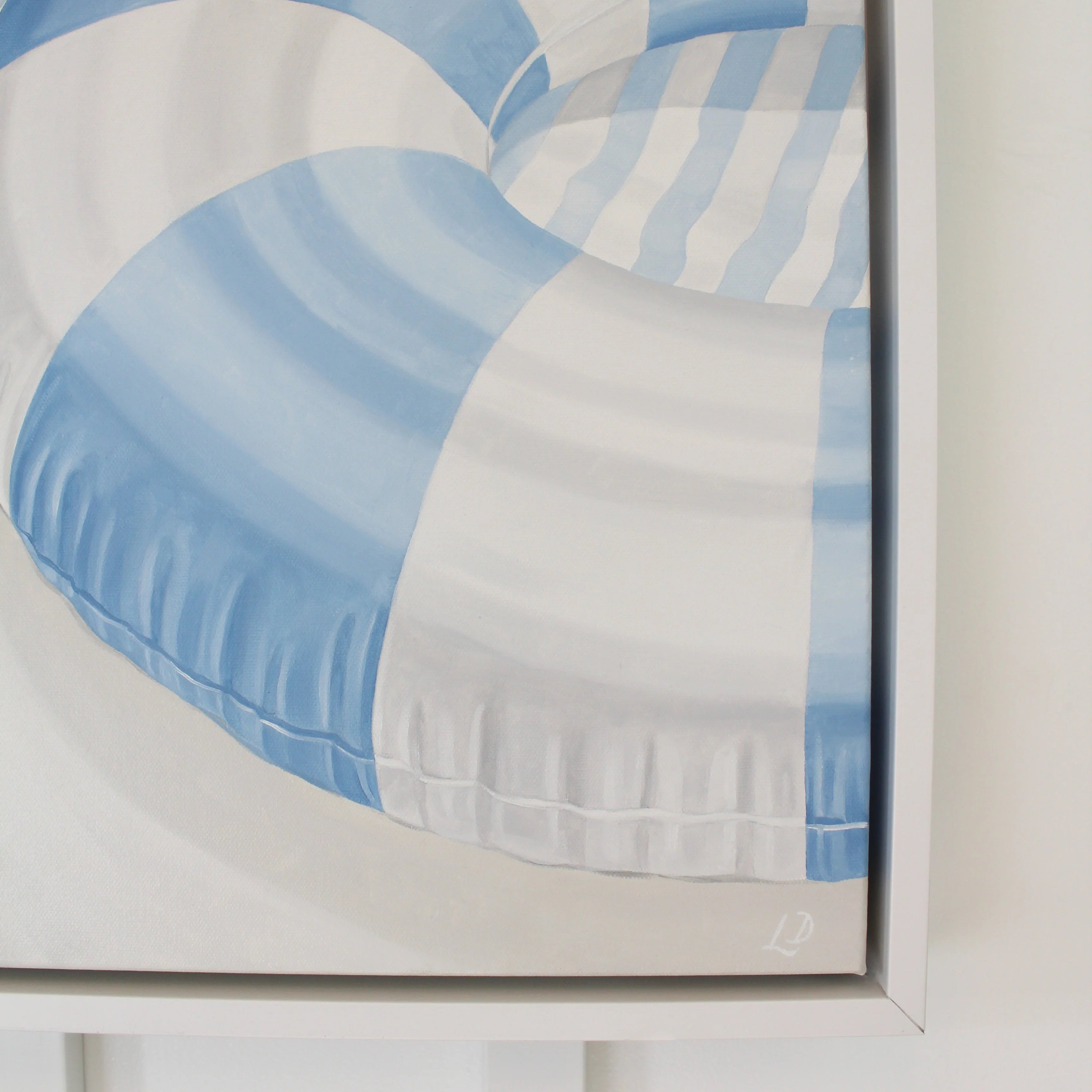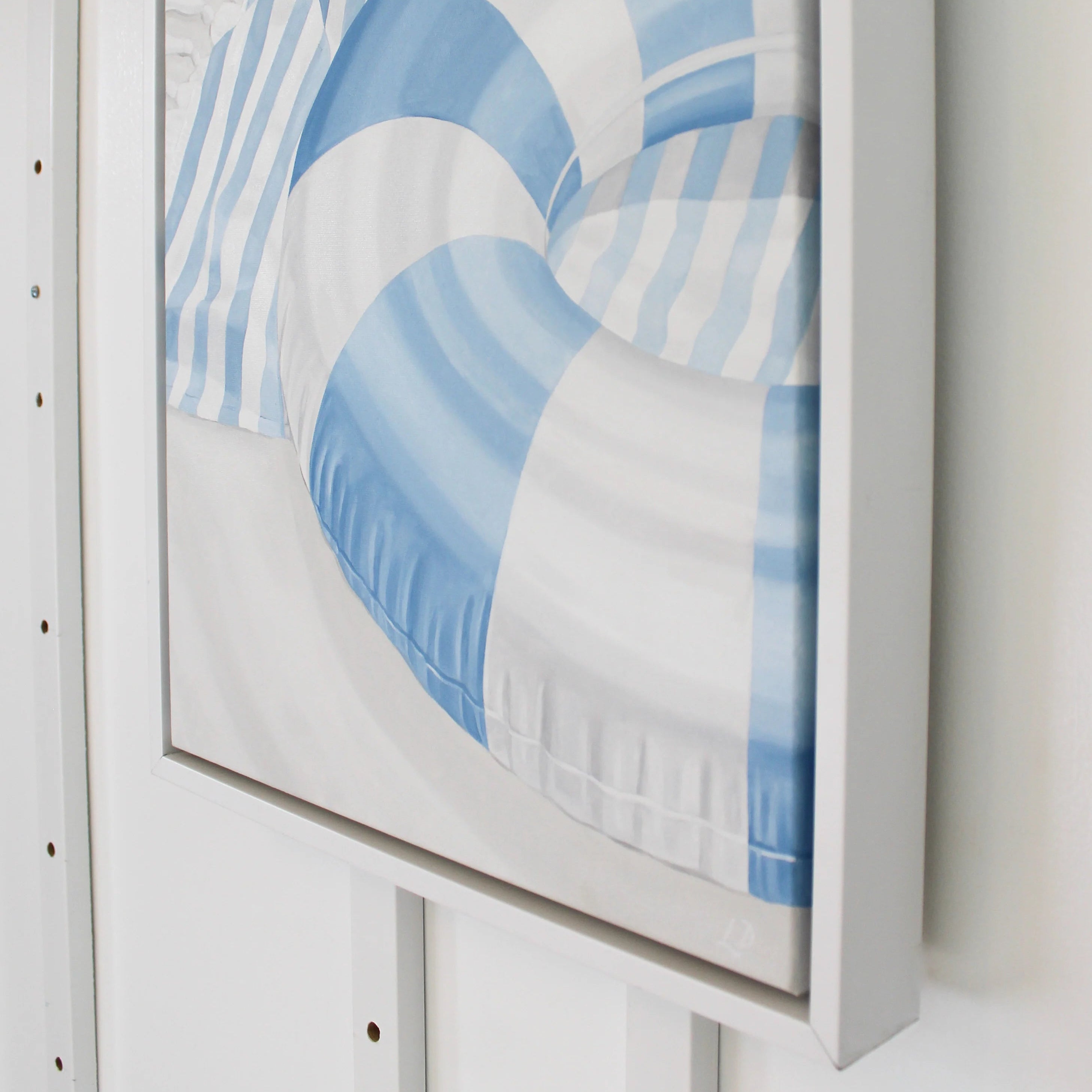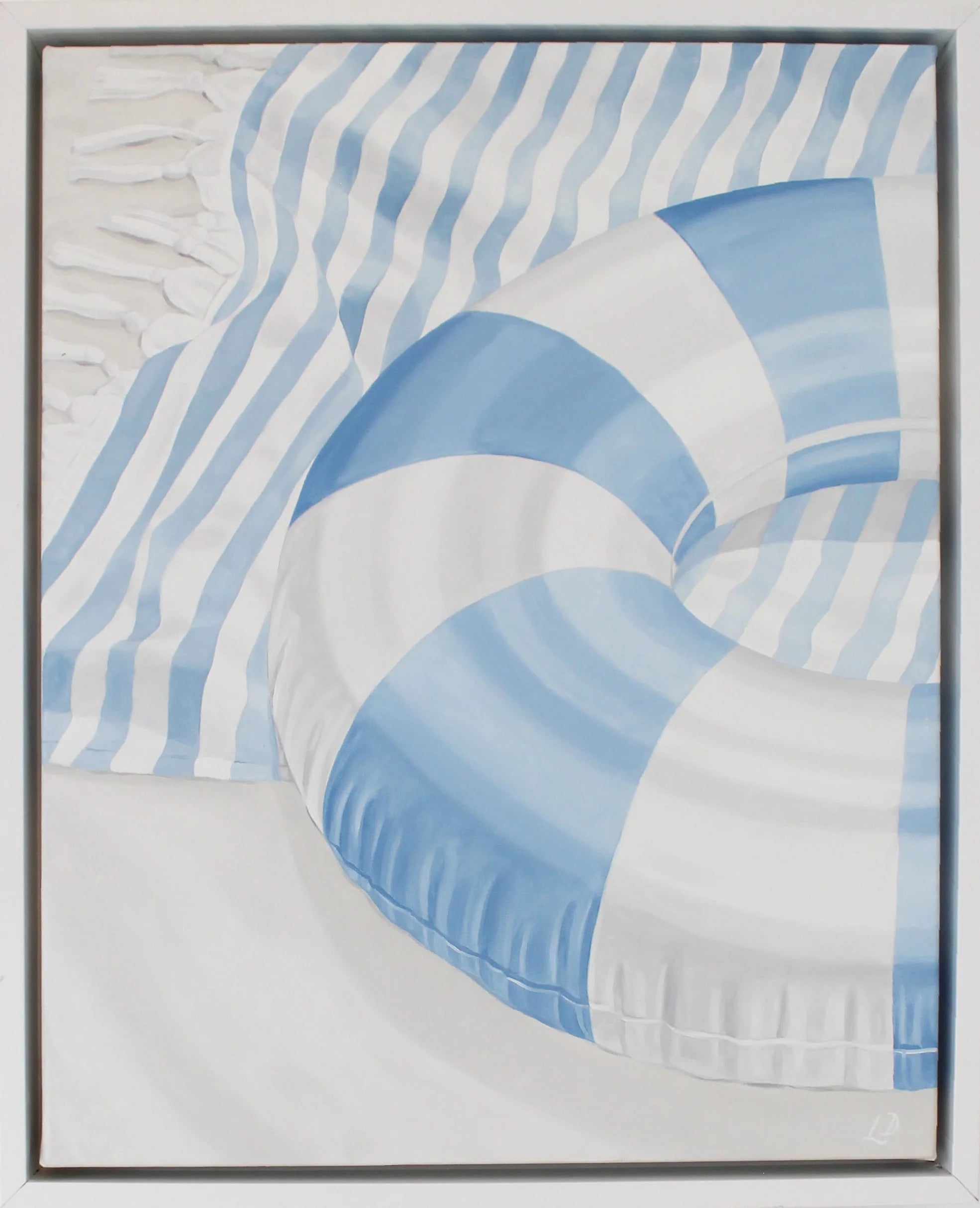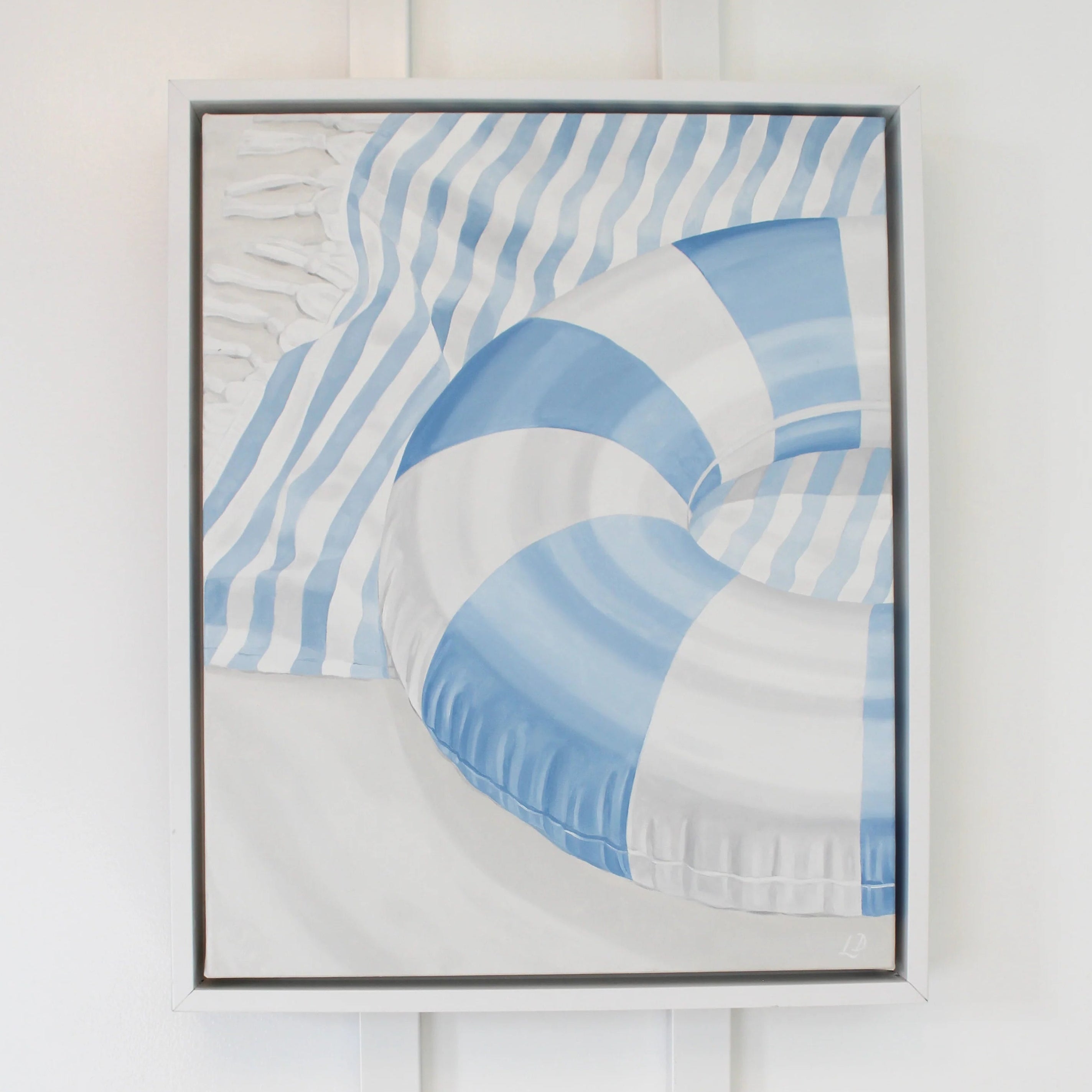 Meet Island Time  - a nostalgic coastal moment captured in Laurie’s signature soft blues, whites, and sandy tones. This framed canvas painting features a charming striped pool float resting beside a matching beach towel, evoking slow mornings and sun-drenched days by the water. Finished in a crisp white solid-wood float frame, it’s the perfect piece to bring laid-back coastal ease into any space.