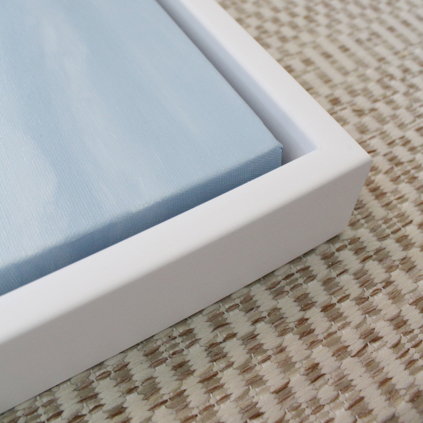 Oil painting on a gallery wrapped cotton canvas. Beautifully framed in a white wood floating frame.