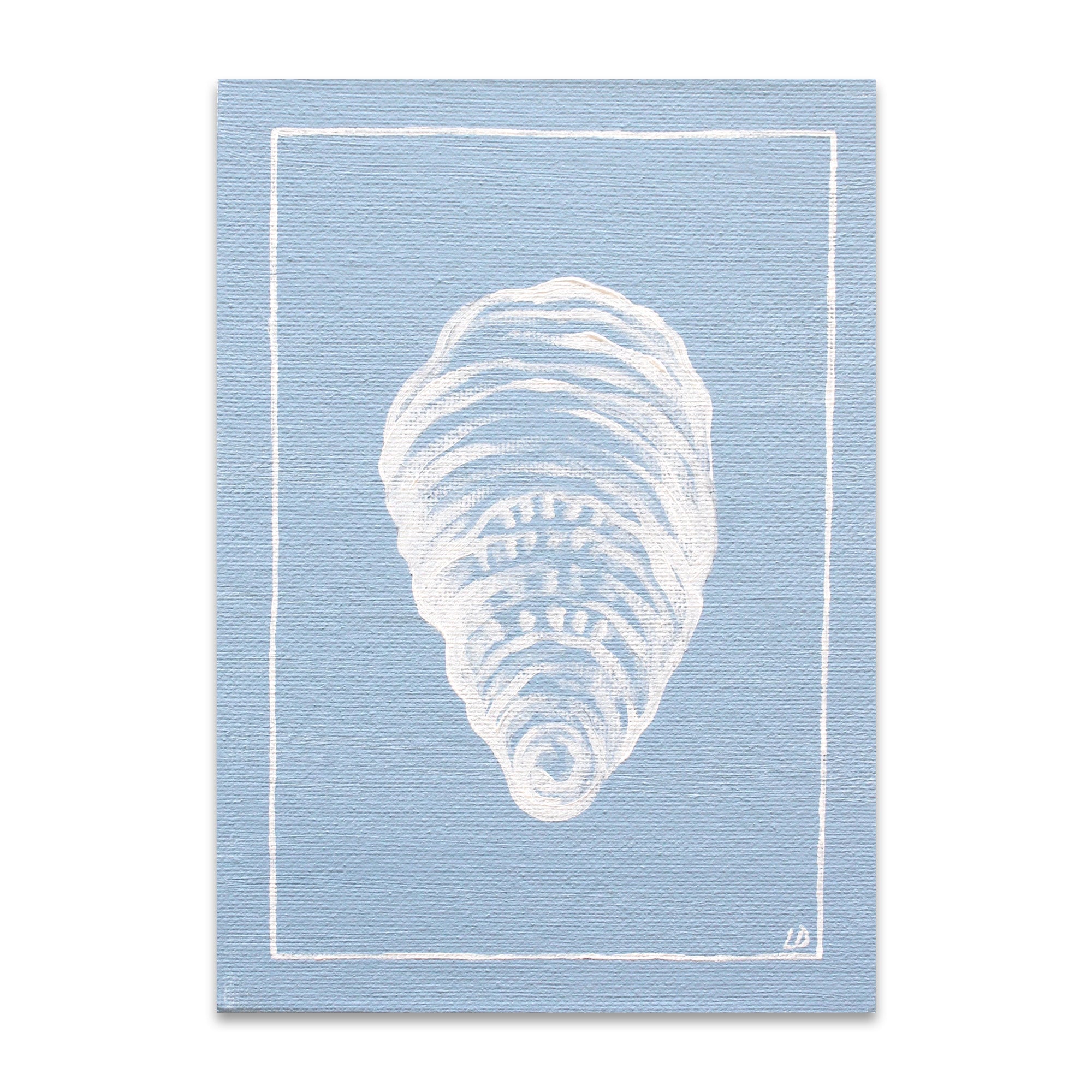 Original acrylic painting 'Petite Oyster Shell on Blue' on canvas panel by artist, Laurie Duncan.