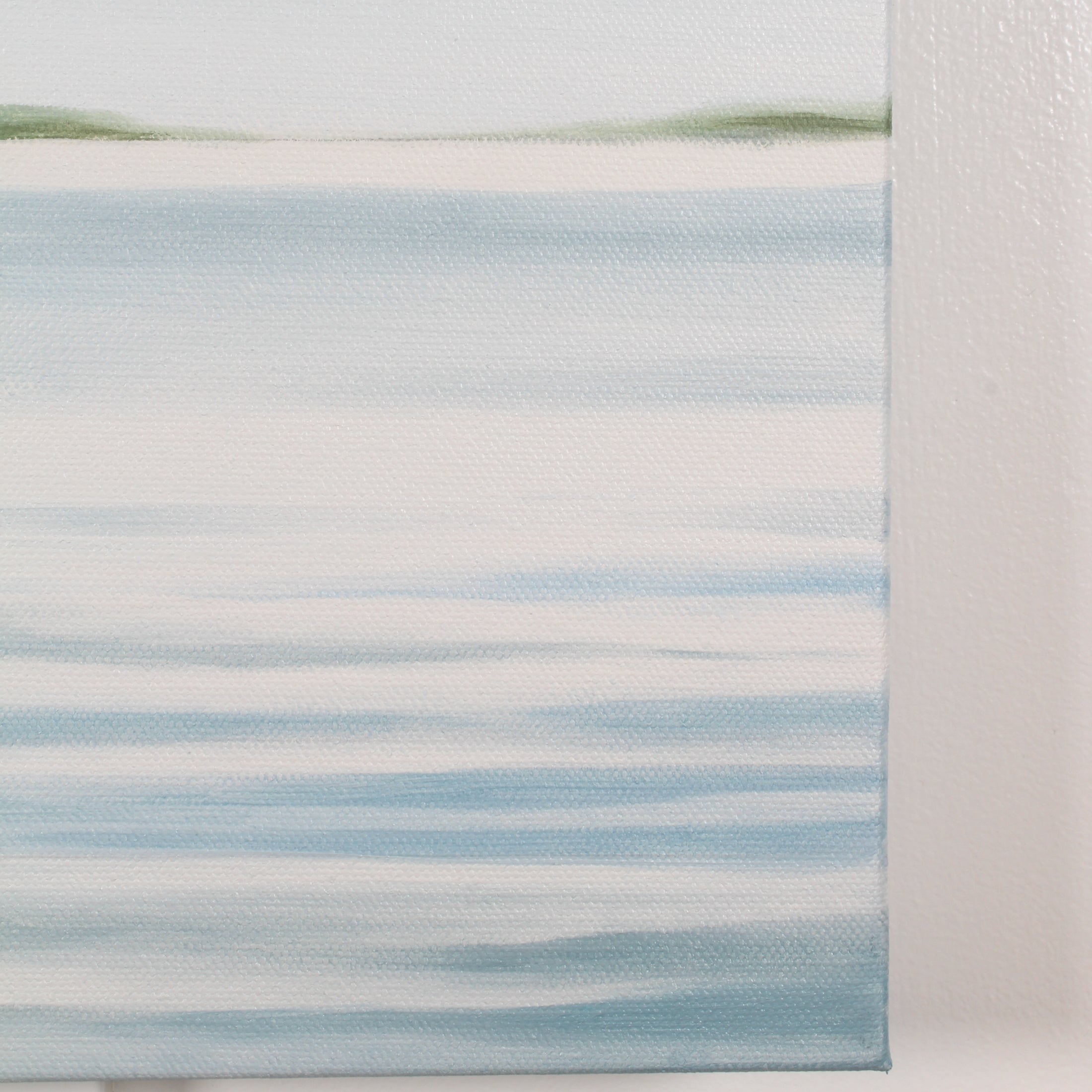Original canvas painting 'Lake Reflection' by artist, Laurie Duncan. Soft sage greens and dusty blues bring a beautiful sense of calm with this lake-inspired piece.
