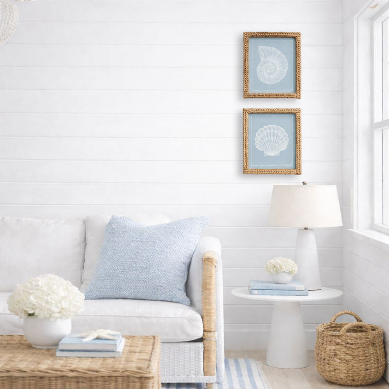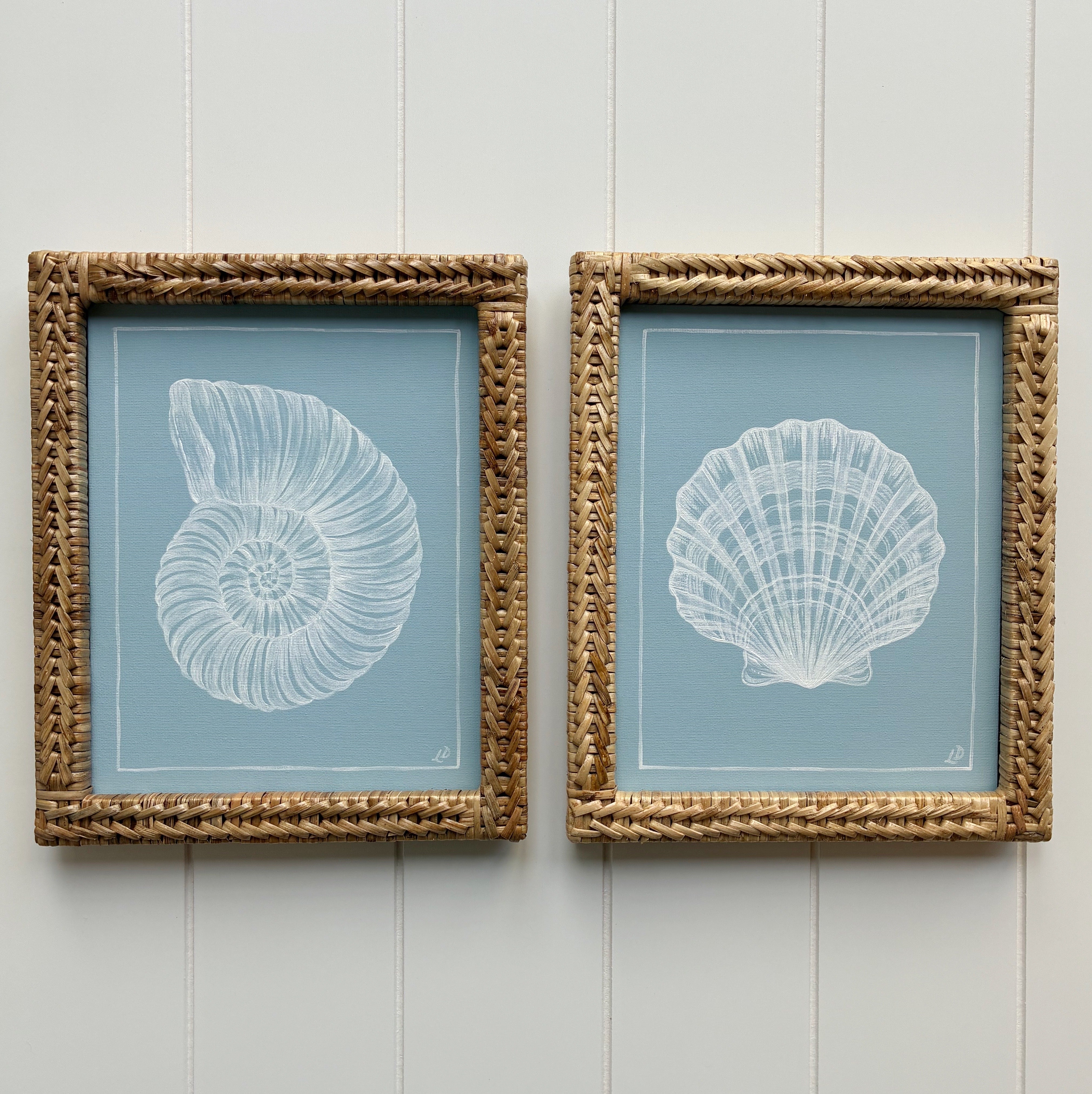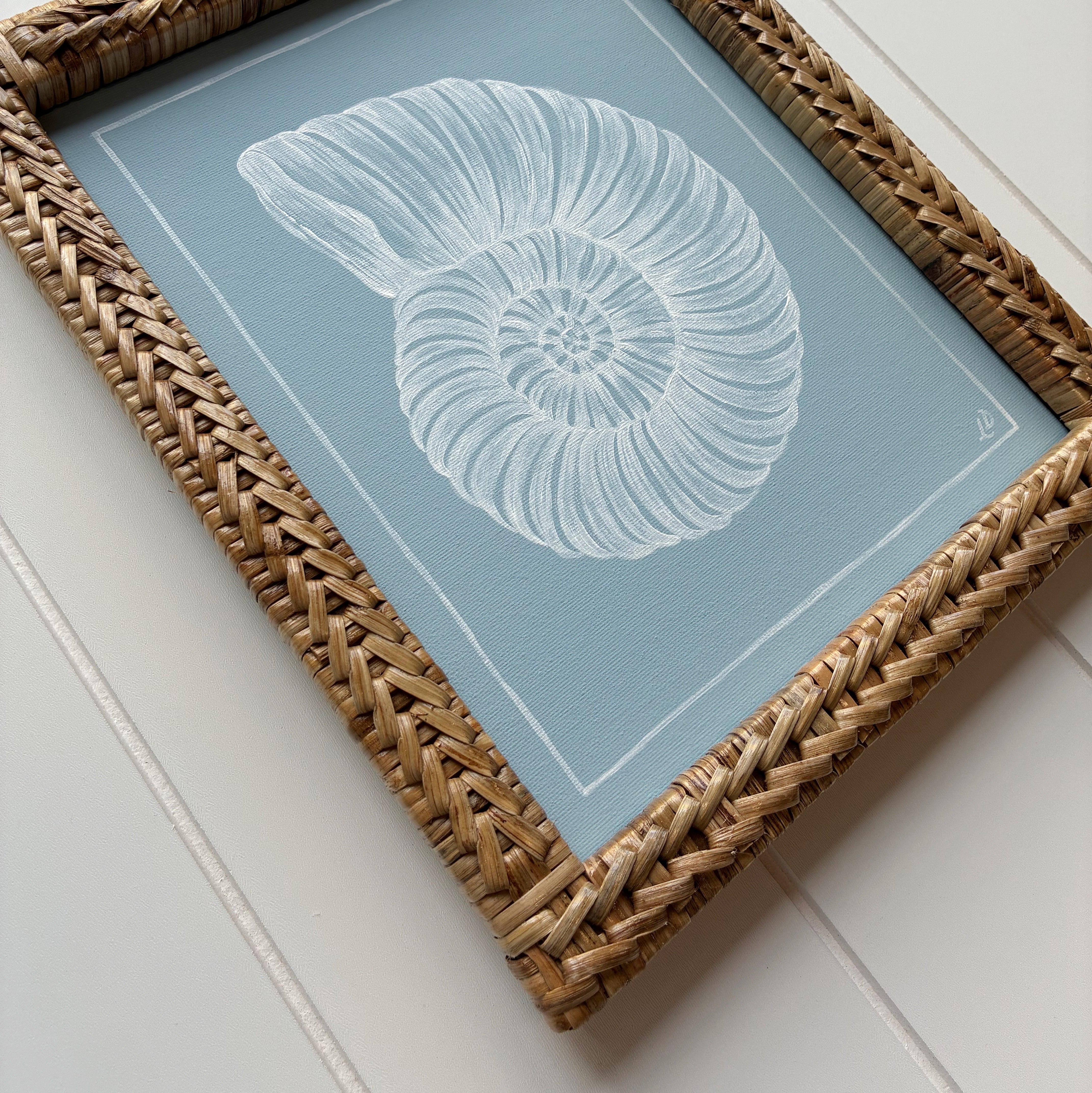 Meet Nautilus Shell on Dusty Blue No.1 - an 8x10" original acrylic painting framed in natural woven rattan. Its soft dusty blue tones and hand-painted nautilus bring effortless coastal style to any room.