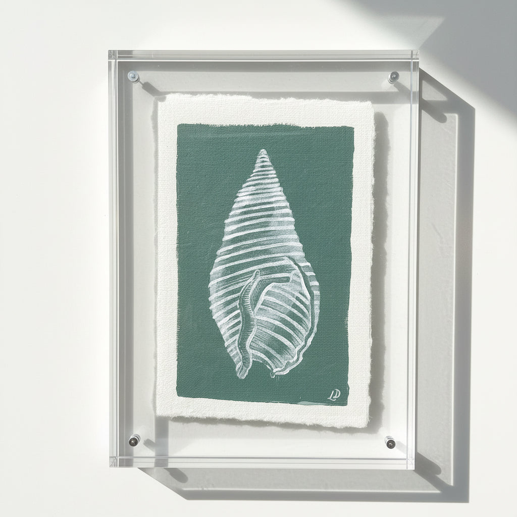 Meet Whelk Shell on Southern Green - an original acrylic painting on handmade deckled edge paper, framed in an 6x8" acrylic block frame . Its soft southern green tones and hand-painted shell bring effortless coastal style to any room.