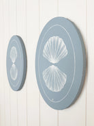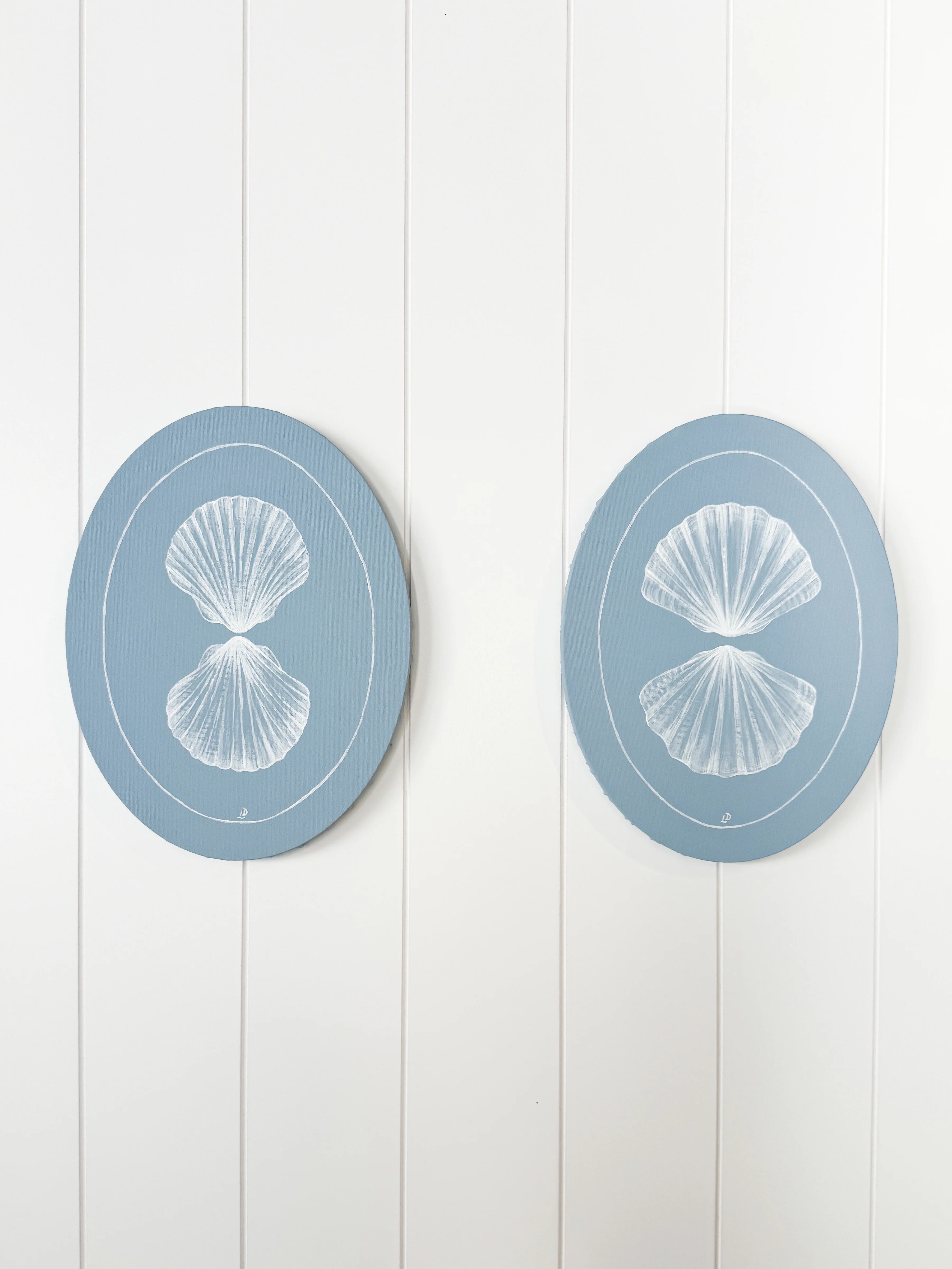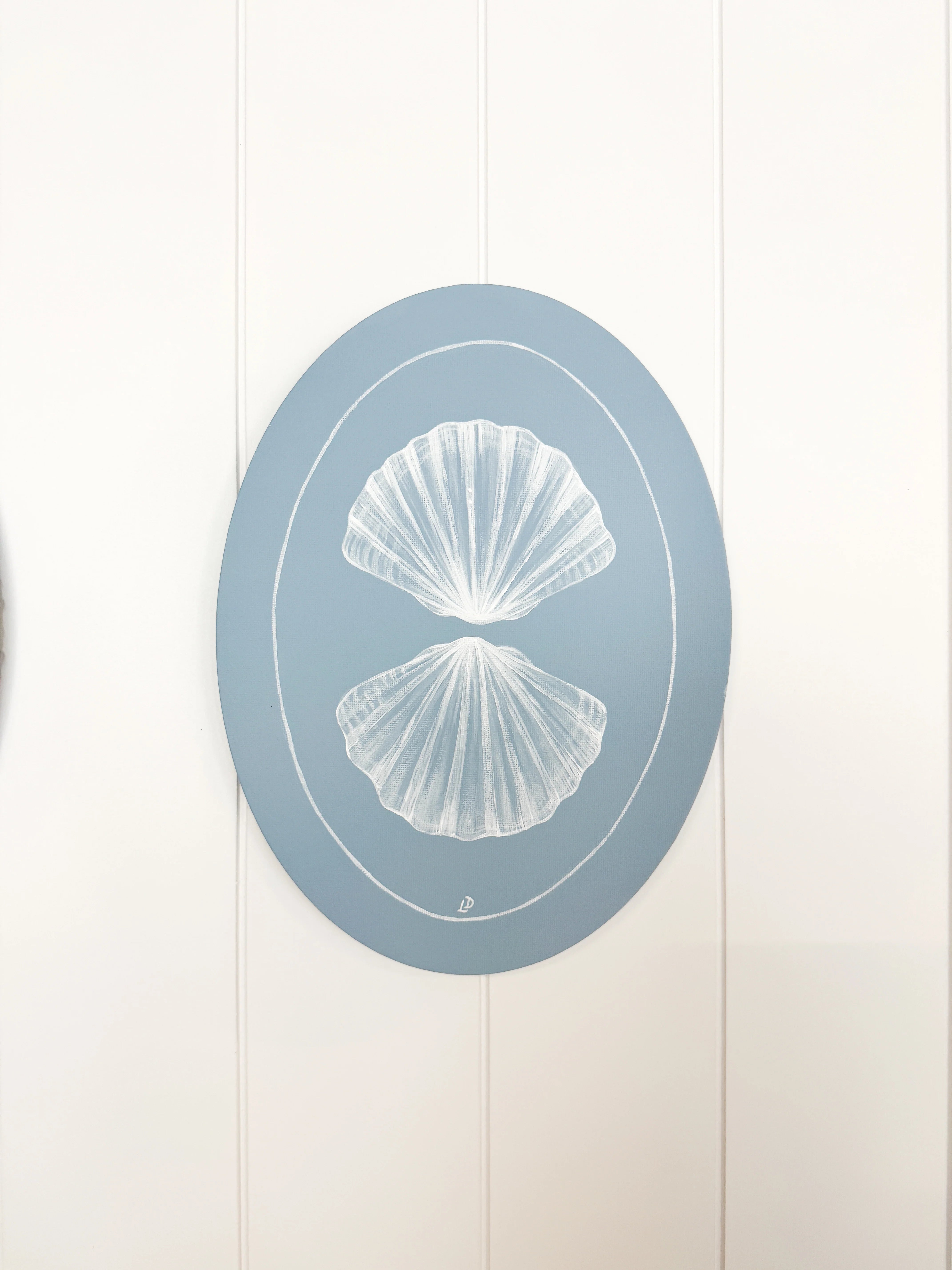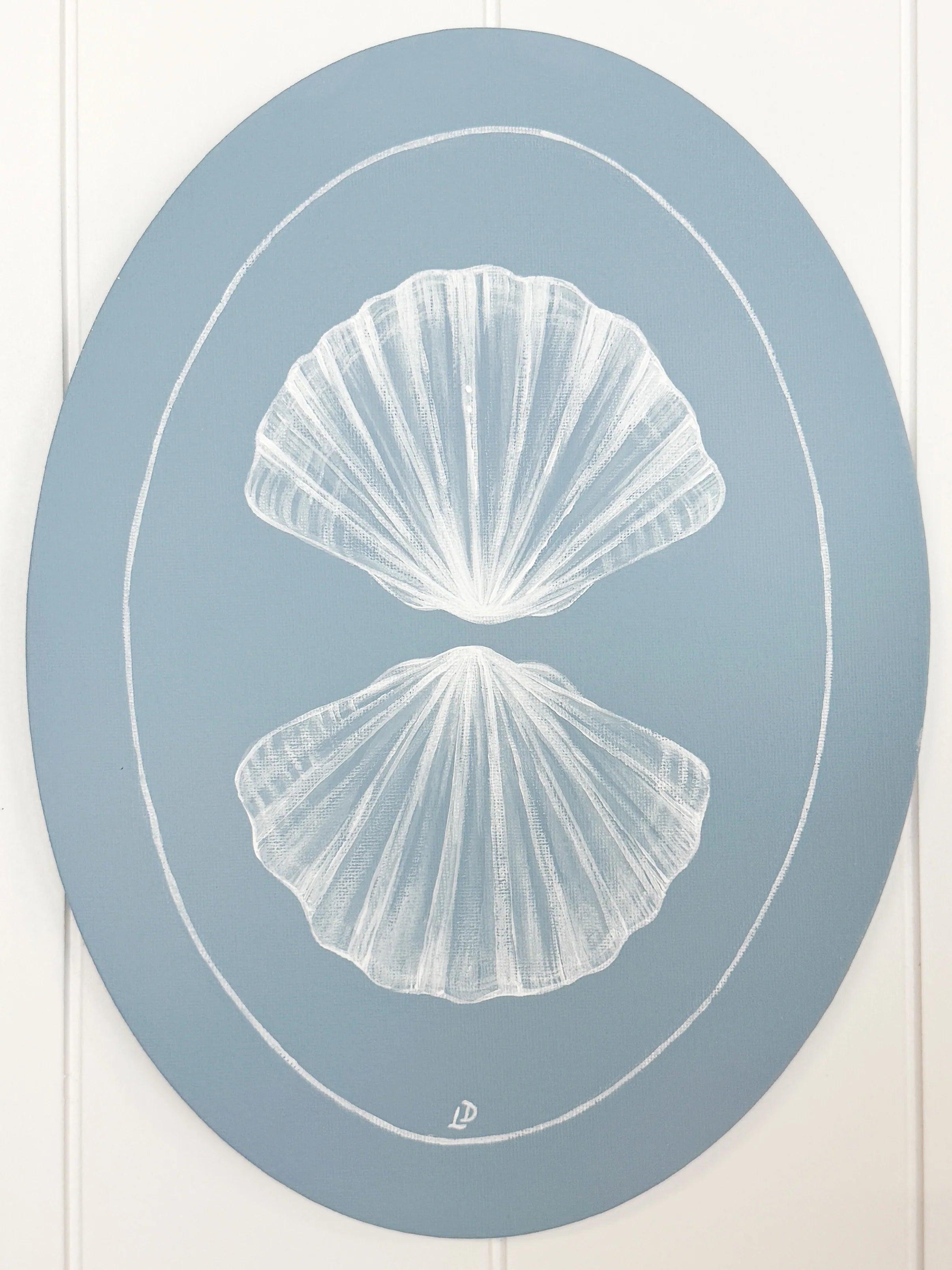 Meet Fan Shell Reflection - an original acrylic painting on an oval cotton canvas . Its soft dusty blue tones and hand-painted fan shells bring effortless coastal style to any room.