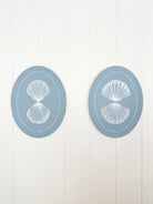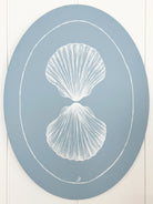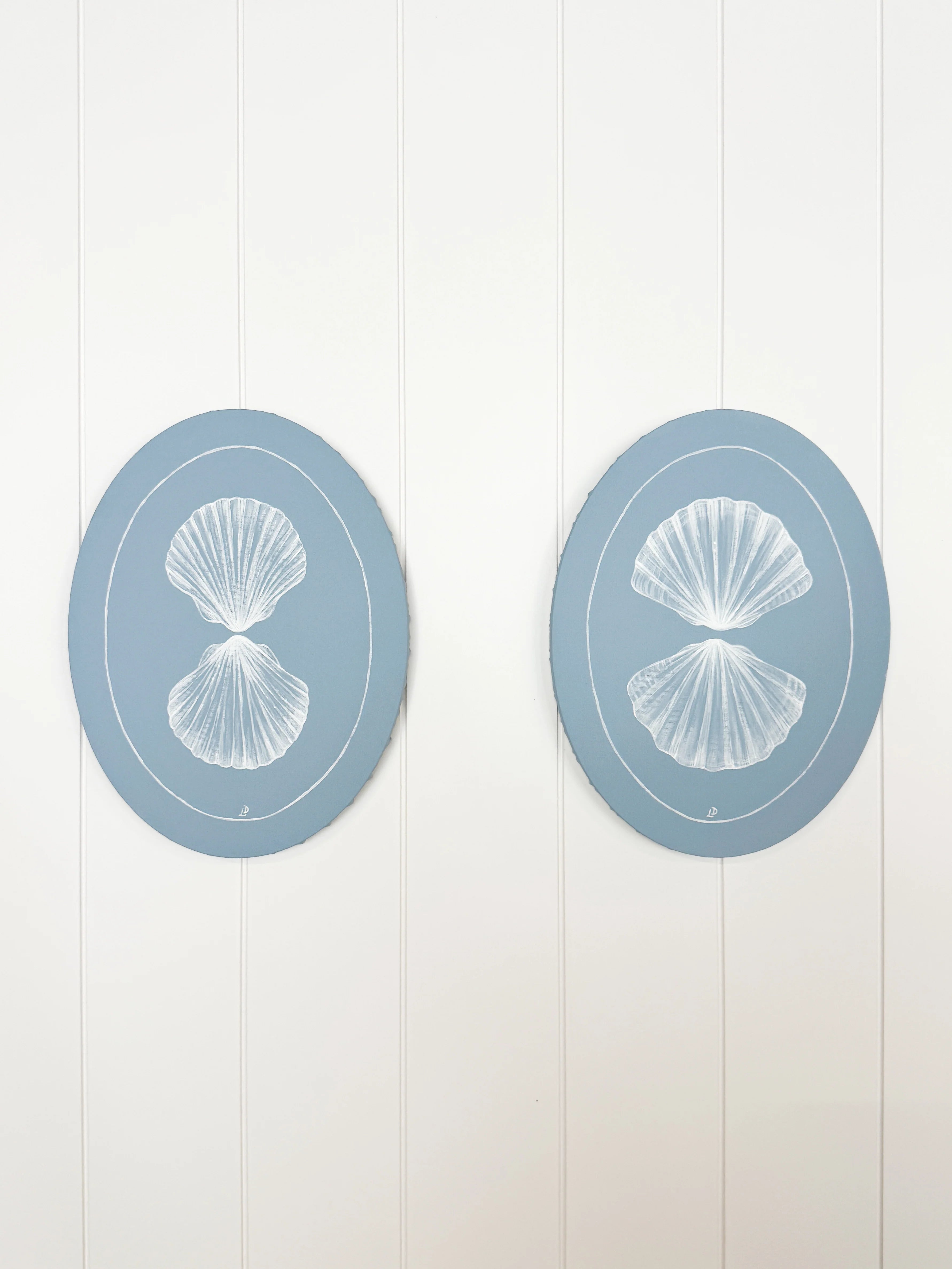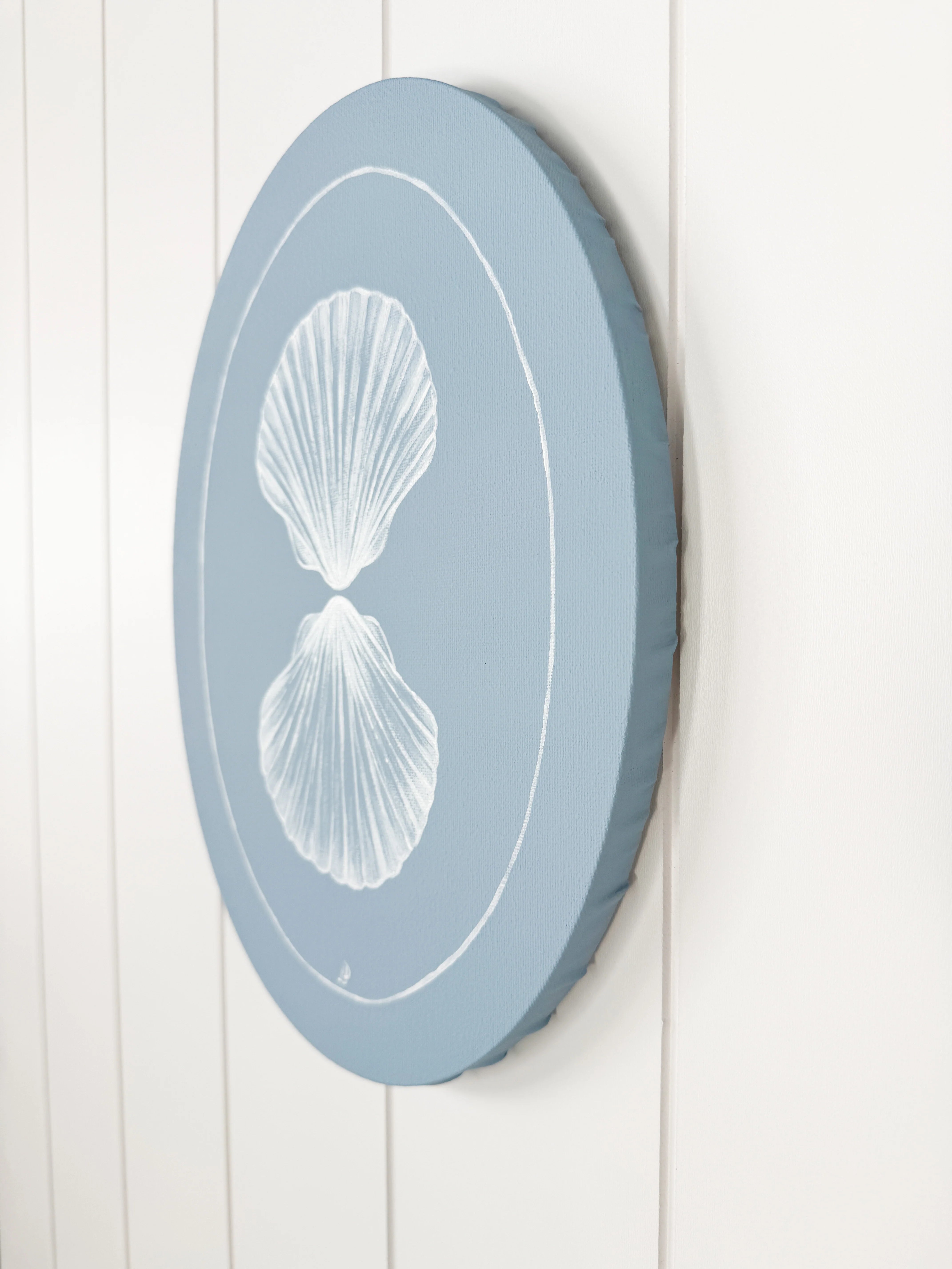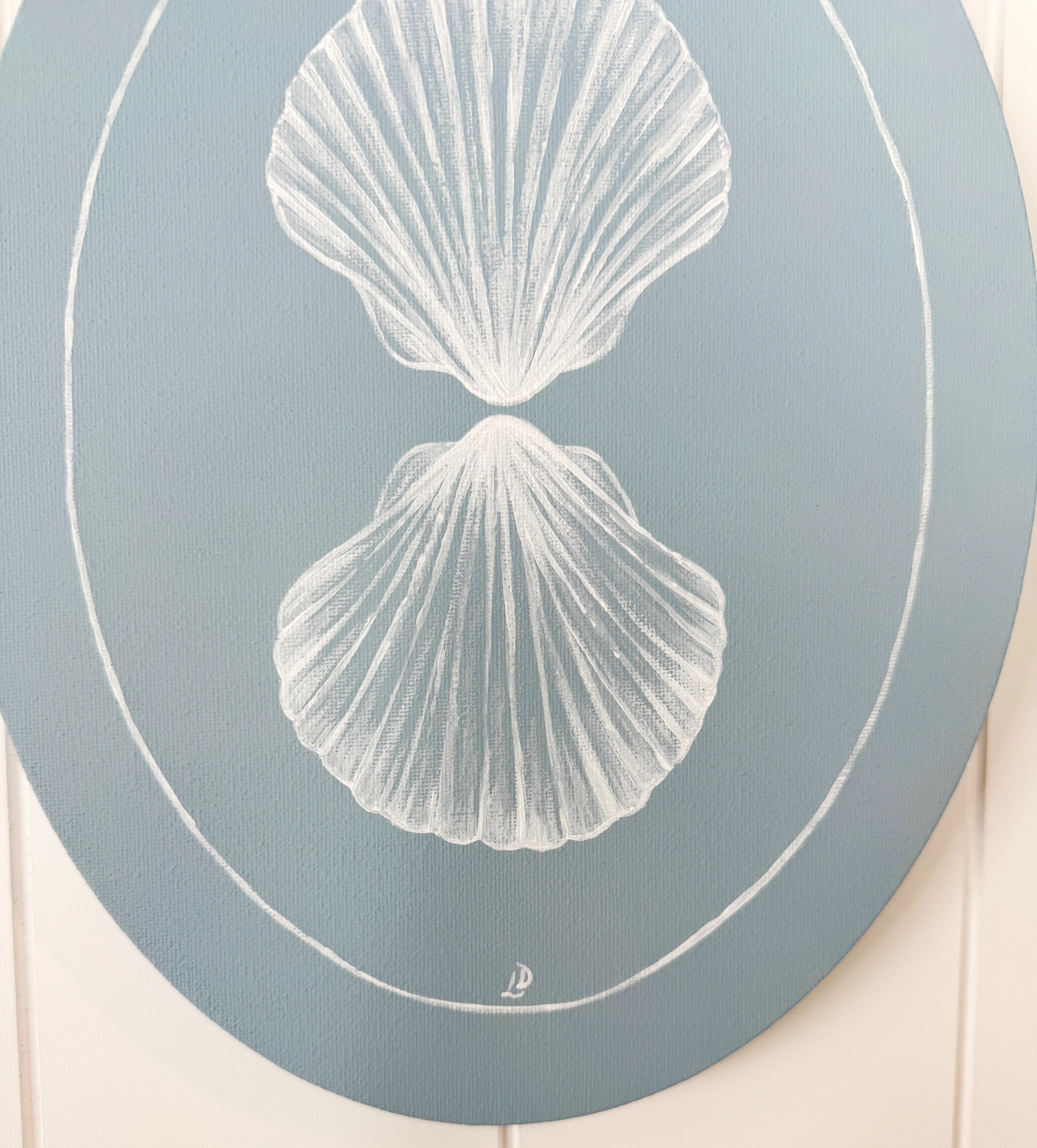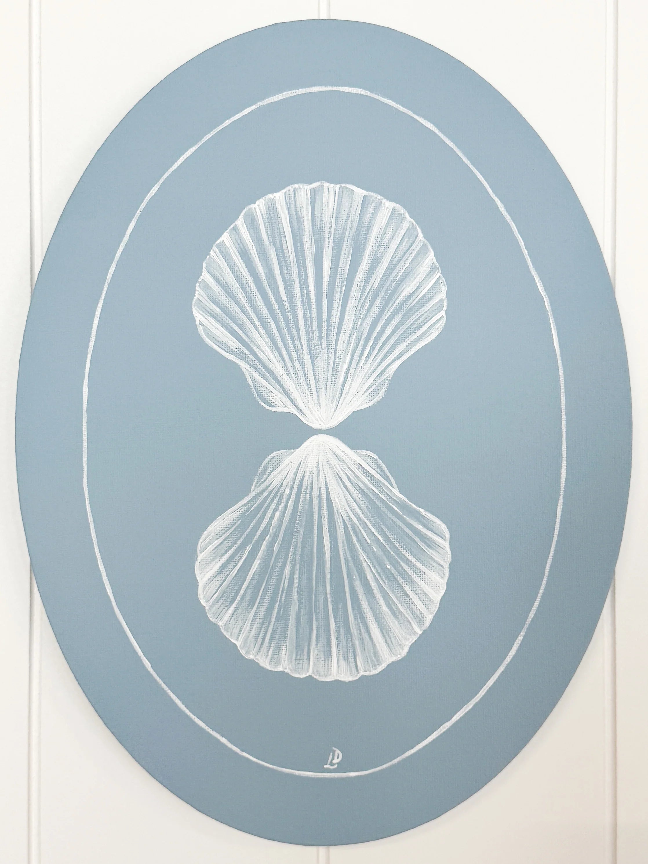 Meet Scallop Shell Reflection - an original acrylic painting on an oval cotton canvas . Its soft dusty blue tones and hand-painted scallop shells bring effortless coastal style to any room.