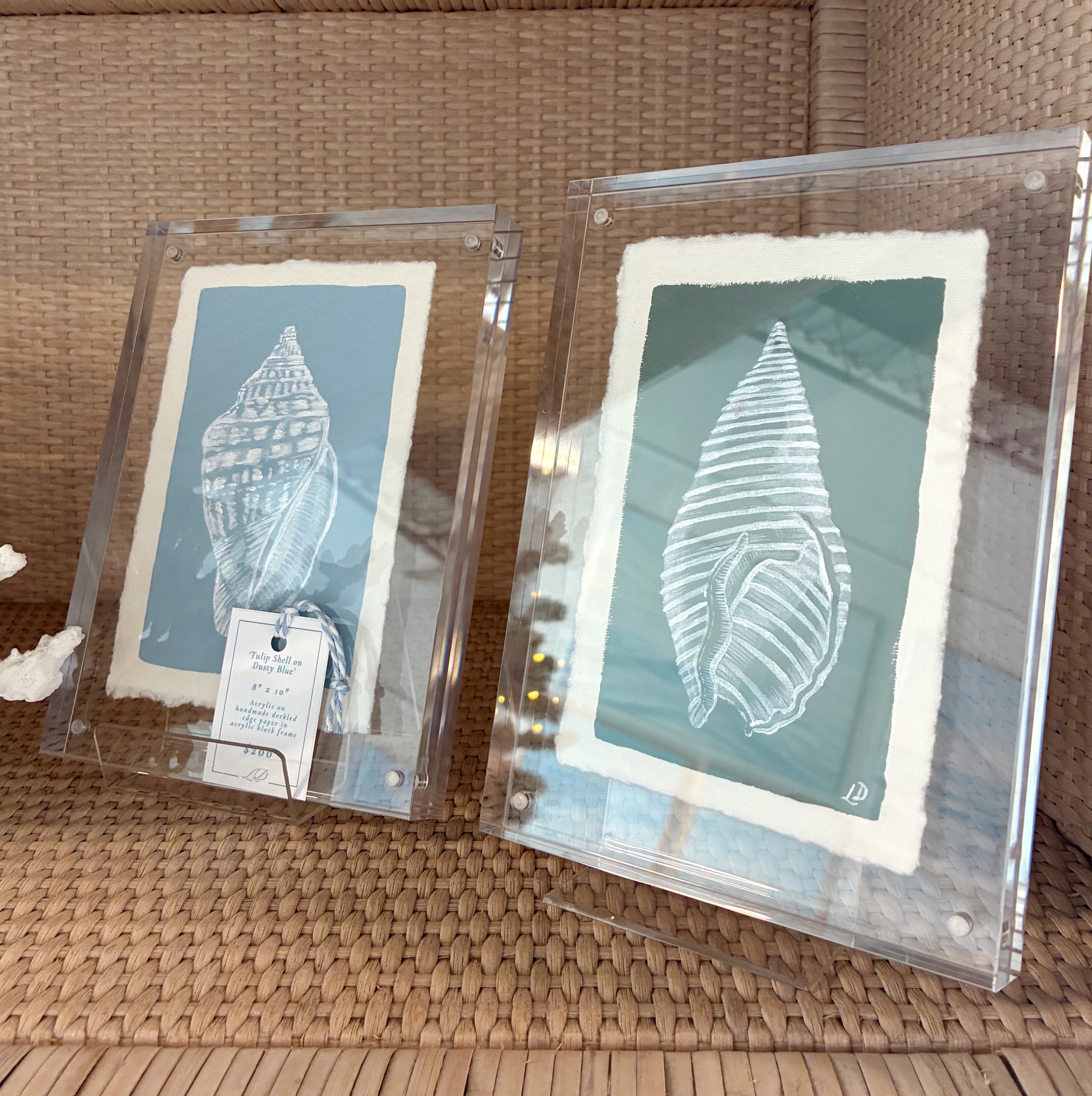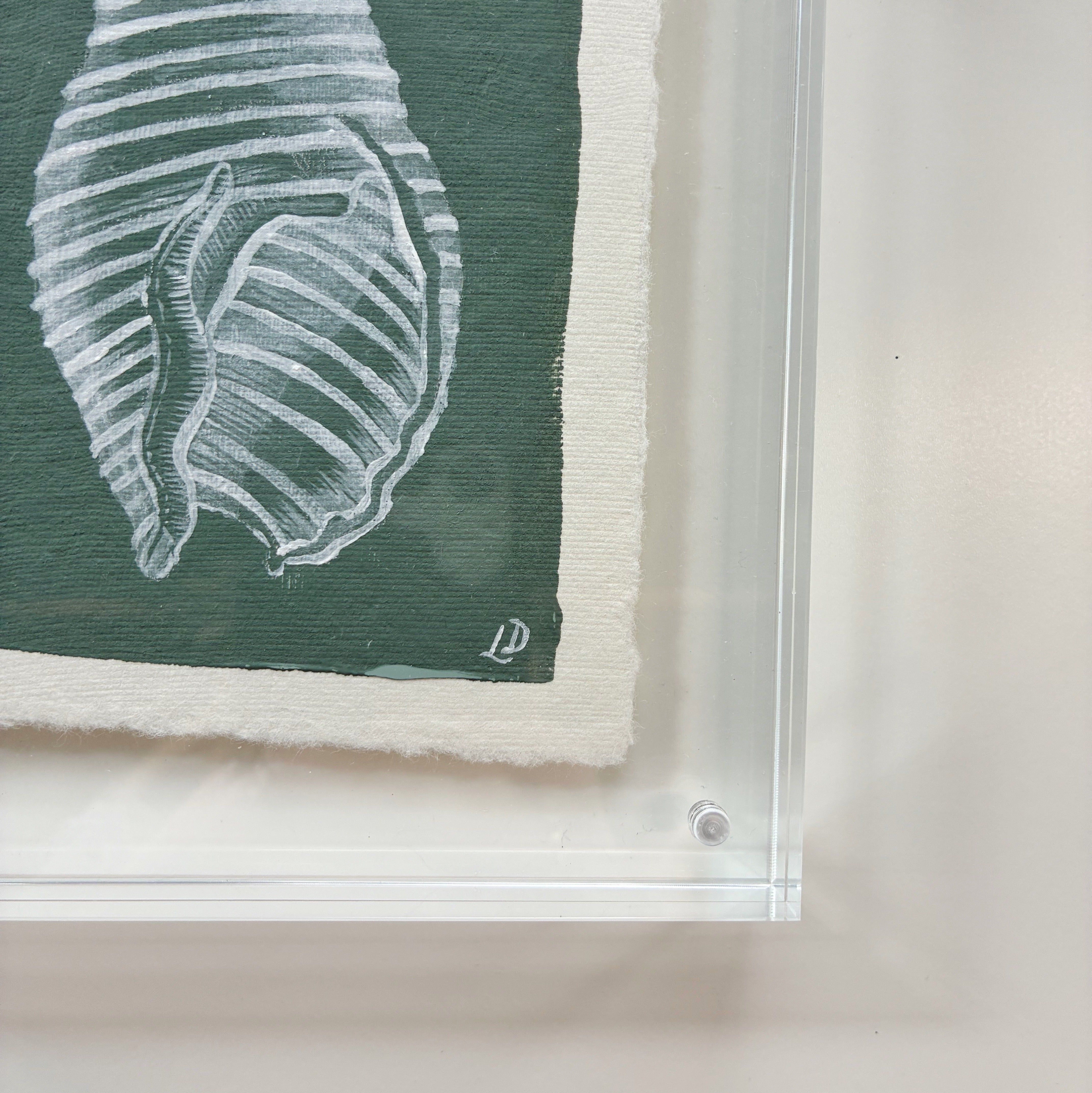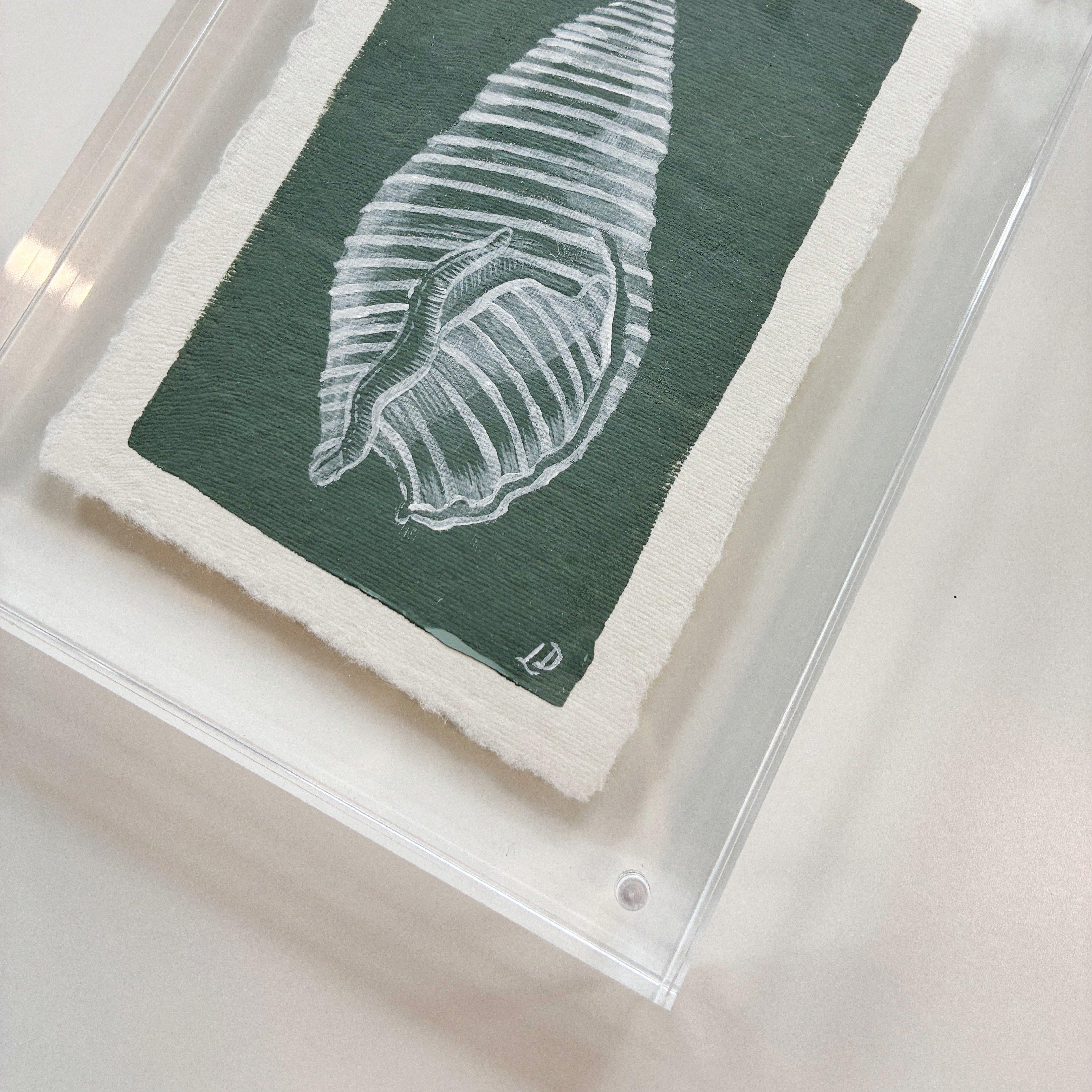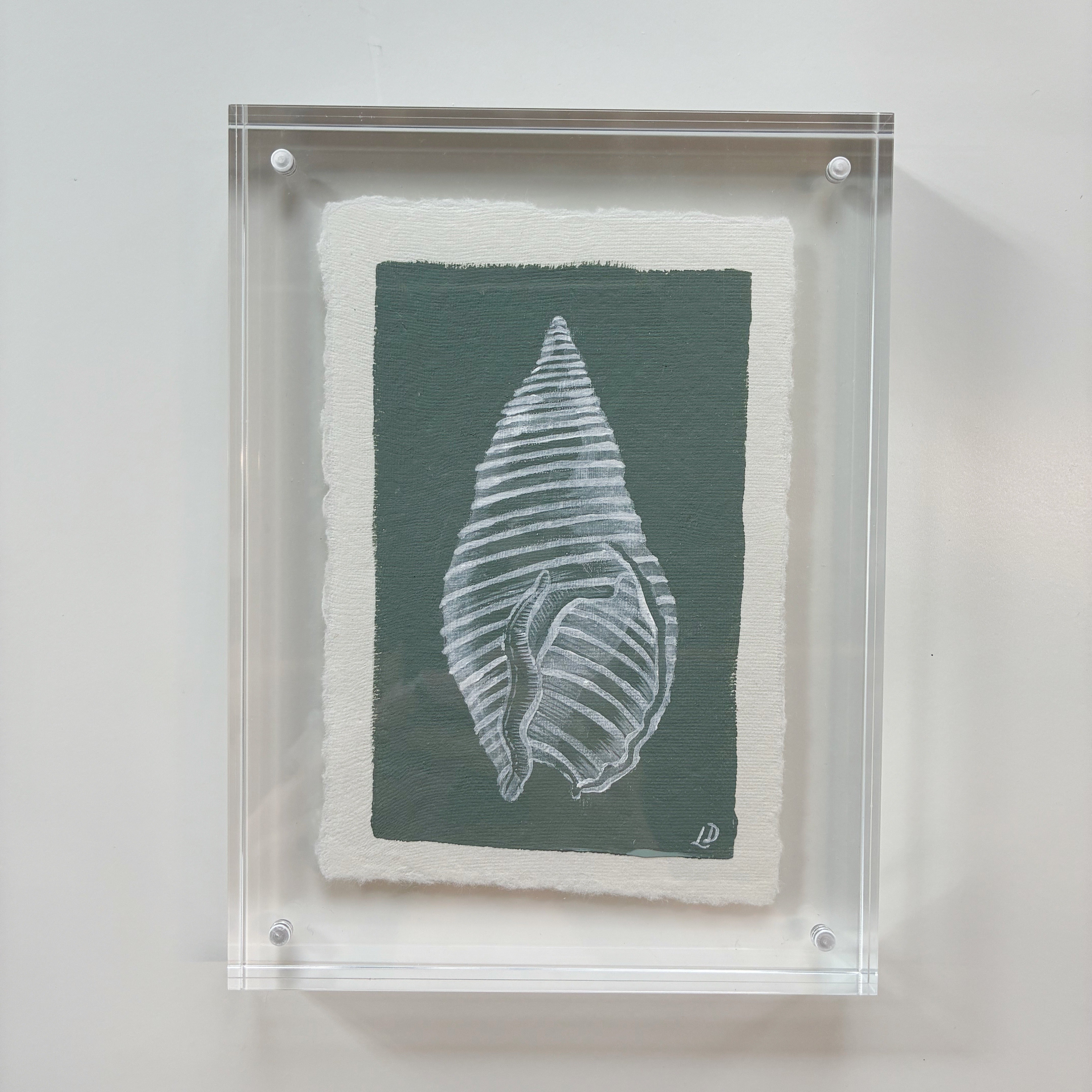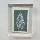Meet Whelk Shell on Southern Green - an original acrylic painting on handmade deckled edge paper, framed in an 6x8" acrylic block frame . Its soft southern green tones and hand-painted shell bring effortless coastal style to any room.